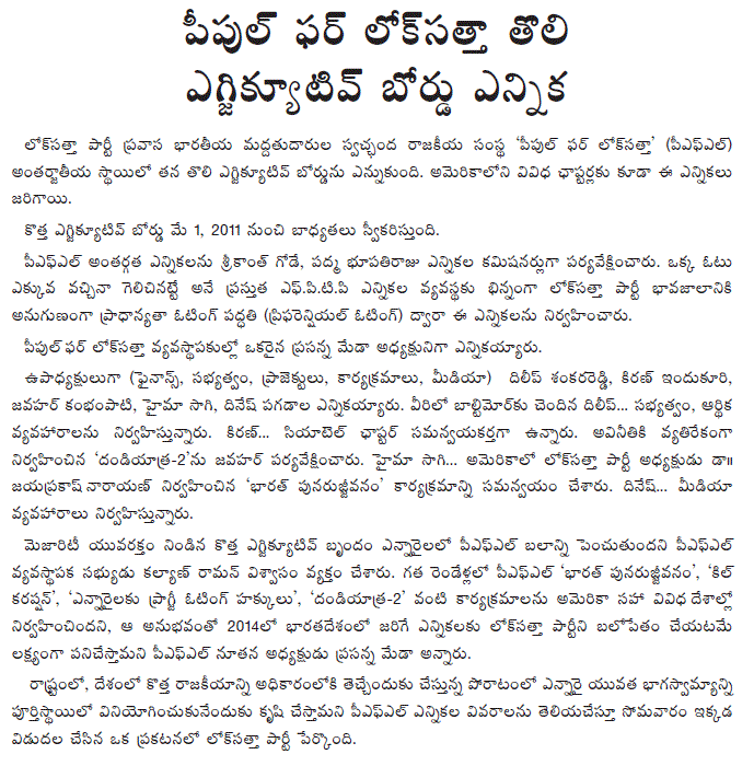 The People for Lok Satta (PFL), the nonprofit political organization of overseas supporters of the Lok Satta Party, adopted a new constitution and elected its first Executive Board at the international level and several chapter-level boards across the U. S.