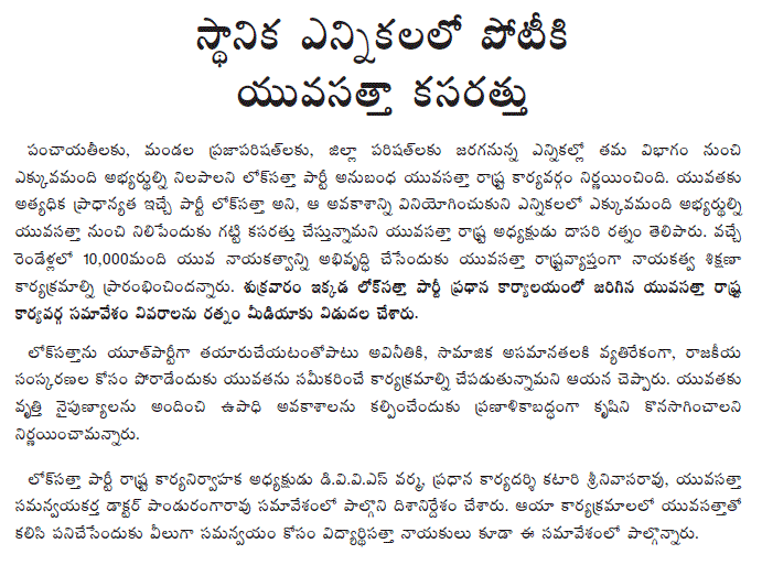 The State Working Committee of the Yuva Satta, the youth wing of the Lok Satta Party, today decided to field candidates in the ensuring elections to panchayats, mandal praja parishads, and zilla parishads.