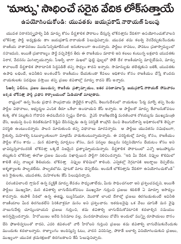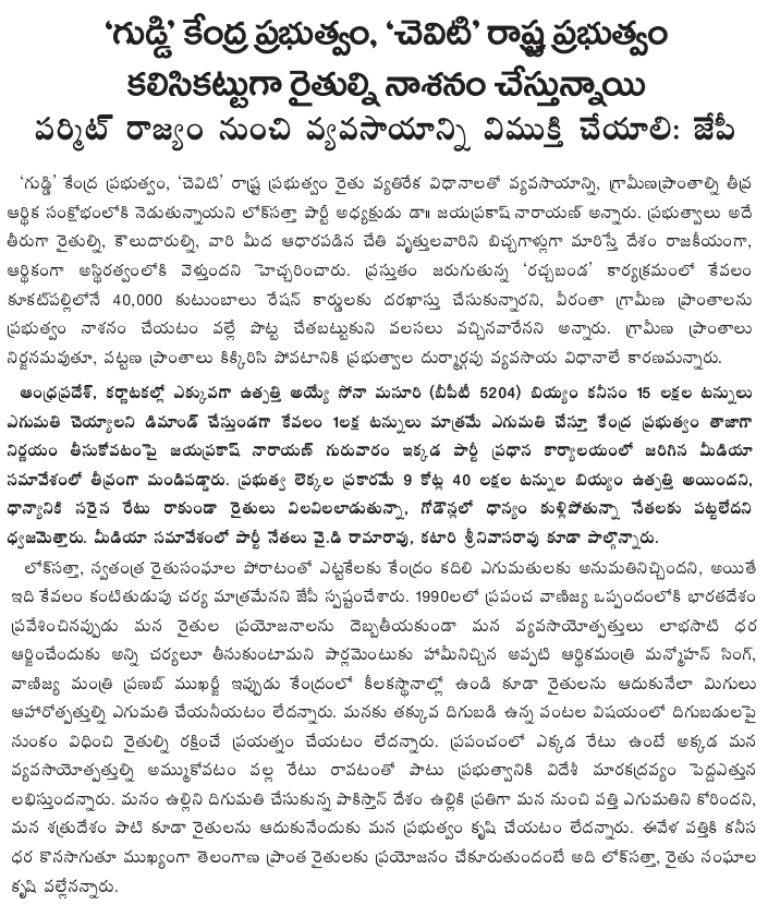 When a reporter pointed out that Congress and Telugu Desam leaders were accusing each other of indulging in corruption running into Rs.1 lakh crore, Dr. JP said that both of them are speaking the truth although there may be the same dispute about the magnitude of the evil. That is why the Lok Satta Party would like the ruling and the Opposition parties to amend the Prevention of Corruption Act in the coming budget session of the Assembly. The Bill provides for exemplary punishment including imprisonment and confiscation of the ill-gotten wealth of the guilty.