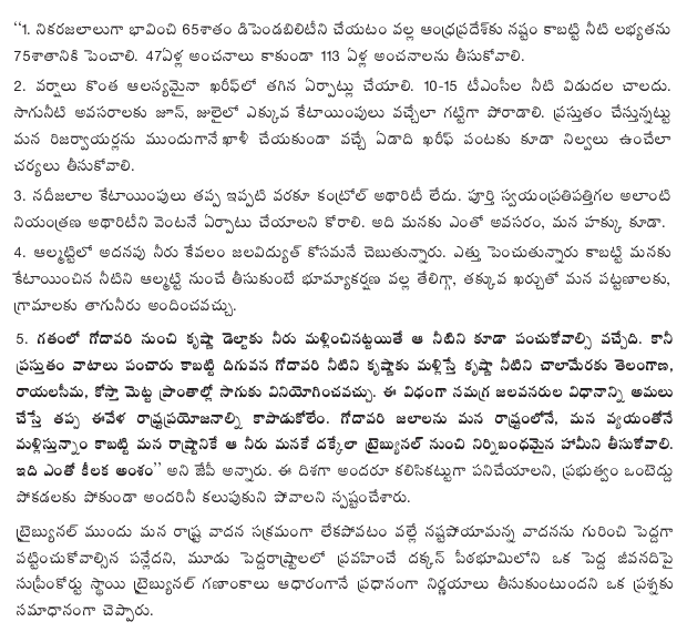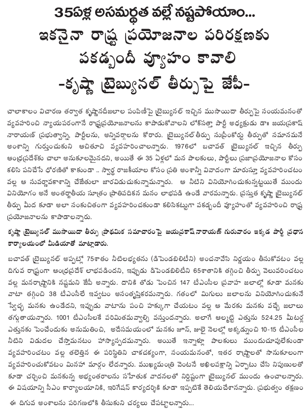 Commenting on the Krishna Water Dispute Tribunal verdict, Dr. JP told the media that the State had forgone the golden opportunity of building projects to utilize the surplus waters in the Krishna to which it was entitled under the the Bachawat Tribunal verdict of 1976. Had not rulers and parties wasted precious 35 years in wrangling over petty matters for partisan gains, the State would have enjoyed the right of first use and received higher allocation under the Brajesh Kumar Tribunal verdict now.