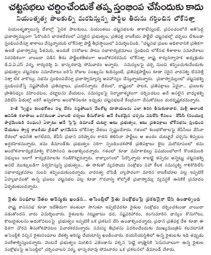 The Lok Satta condemned the State Government for arresting farmers’ leaders who had come to the Legislature premises to represent their problems to the Chief Minister. The Government ought to have made a statement on ensuring remunerative prices to farmers for their produce, purchase of discolored paddy, input subsidy, and measures to help tenants.
