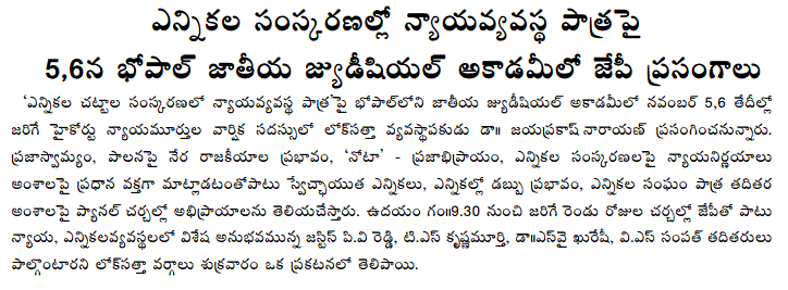 ఎన్నికల సంస్కరణల్లో న్యాయవ్యవస్థ పాత్రపై 5,6న భోపాల్ జాతీయ జ్యుడీషియల్ అకాడమీలో జేపీ ప్రసంగాలు Friday, November 4, 2016 - 15:30