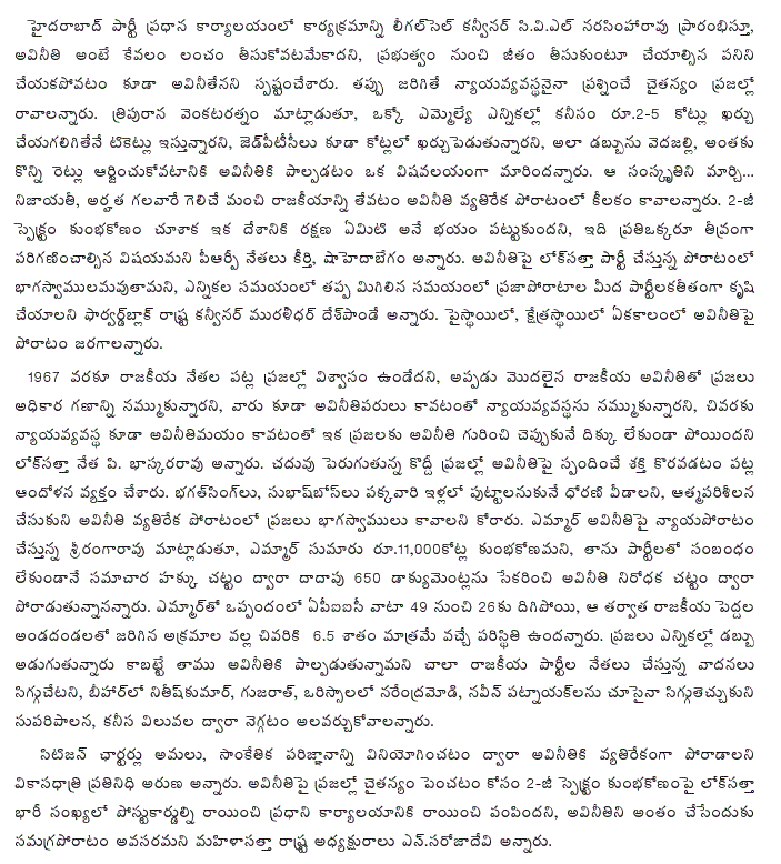 Initiating the debate, Legal Cell Convener C. V. L. Narasimha Rao said that failure to discharge one’s duty as a Government employee too was a corrupt practice. Corruption did not mean mere acceptance of a bribe. Mrs. T. Venkataratnam said that corruption had become vicious as politicians who spent crores of rupees in elections enriched themselves many times more once elected. Ms. Keerti and Shaheeda Begum expressed their shock over the 2-G spectrum scam, while Mr. Deshpande said parties should fight against corruption jointly. Mr. Bhaskara Rao said that people had become helpless as politicians, officials and judges had all become corrupt one after another over the years. He underlined the need for institutional mechanisms and people’s participation to mitigate corruption. Advocate Ranga Rao disclosed that he had obtained 650 documents under the Right to Information Act before launching his battle against the Emaar scandal. Ms. Aruna suggested implementation of citizen charters as a means of curbing corruption while Mrs. N. Sarojadevi recalled Lok Satta’s campaign against the 2-G spectrum.