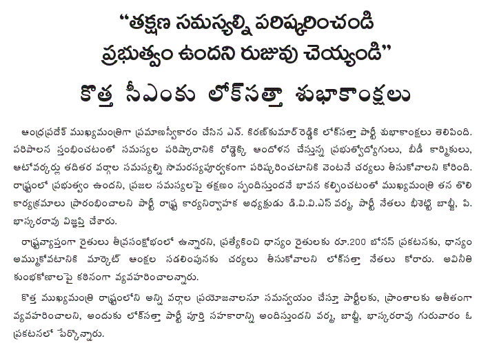 Conveying its greetings to Mr. N. Kiran Kumar Reddy on his assumption of office as Chief Minister, the Lok Satta Party wanted him to find an amicable settlement to issues raised by Government employees, beedi workers, auto rickshaw operators and others. With the administration coming to a standstill, all of them had hit the roads.