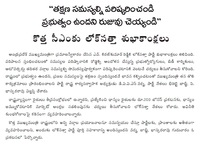 Lok Satta requests CM to Solve pressing problems