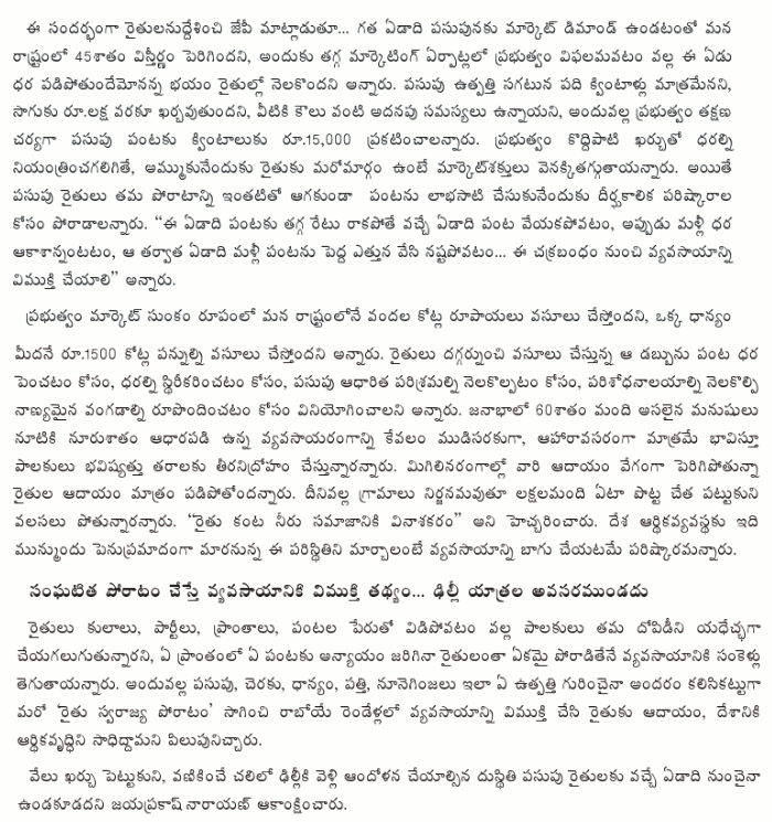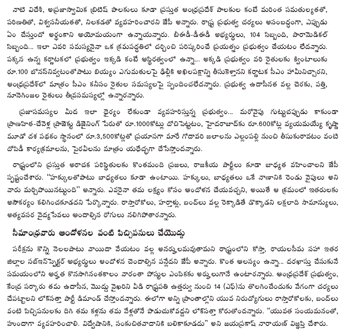 Dr. JP said that sections of people and political parties were equally to blame for the present chaotic conditions. They seem to forget that rights and responsibilities are two sides of the same coin. One could legitimately agitate for a cause but one should not inconvenience others in the process. Rasta rokos, hartals, and bandhs would hurt millions of people who lead a hand-to-mouth existence and deprive critical patients of prompt medical assistance.