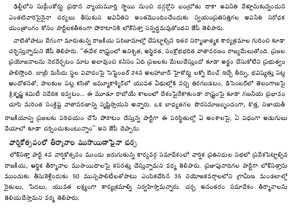 Mr. D. V. V. S. Varma, party Working President, said the Working Committee was discussing resolutions to be introduced in the annual General Council meeting next month. The party will undertake programs roping in farmers, the youth and the poor in 50 municipalities and 35 Assembly constituencies.