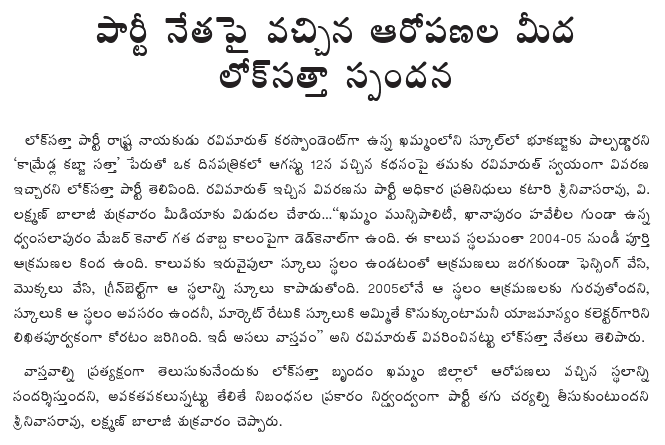 Lok Satta, Mahila Satta, and Yuva Satta leaders including V. Laxman Balaji, S. Manorama, P. Bhaskara Rao, Bandaru Rammohana Rao, Eeda Chennayya, N. Saroja Devi, K. Gita Murthy, Y. Ramadevi, and Mangala took part in the program.