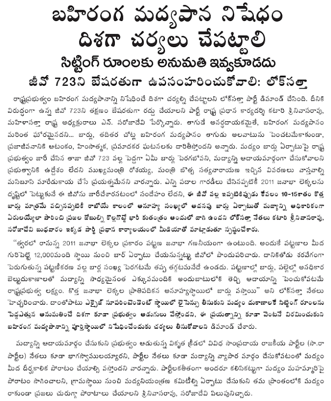 Demanding that the Government ban public drinking, the Lok Satta leaders pointed out that drinking is bad but public drinking is worse. Public drinking is resulting in permissive behavior, disturbing public order and tranquility, leading to accidents and crimes against women and children, promoting binge drinking and pauperization for want of restraint by the family.