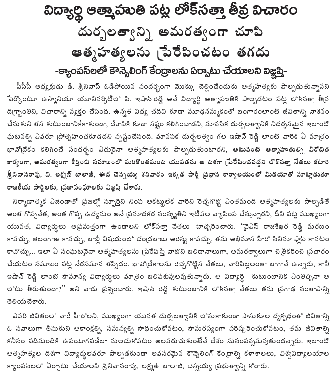 Mr. Mullapally Ramachandran, Union Minister of State for Home Affairs, conveyed this to Lok Satta Party President Dr. Jayaprakash Narayan in response to his representation to Prime Minister Dr. Manmohan Singh during his visit to Hyderabad on October 9, 2009. Party leaders Mr. Katari Srinivasa Rao and Mrs. N. Saroja Devi gave the gist of the communication received from the Union Minister at a media briefing here today.