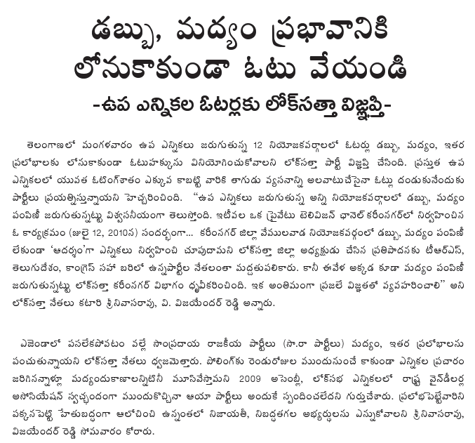 The Lok Satta leader said that successive State Governments had been leasing precious mines to parties in which they are interested without following any transparent policy. “A Government which pleads constraint of resources for funding Sarva Siksha Abhiyan and reimbursing student fees has no business to forgo revenue by handing over mines on a platter to select people. On the contrary, it is pauperizing the already poor people by promoting liquor consumption to maximize its revenue.”