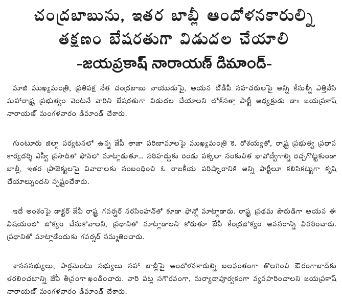 Dr. JP demands unconditional release of Chandrababu and other Babli agitators