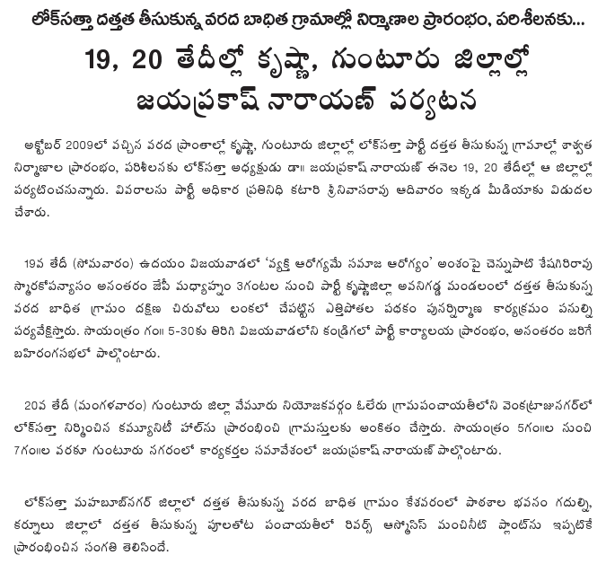 Lok Satta Party President Dr. Jayaprakash Narayan is visiting the villages the party adopted in the wake of the October 2009 floods in Krishna and Guntur districts on July 19 and 20.