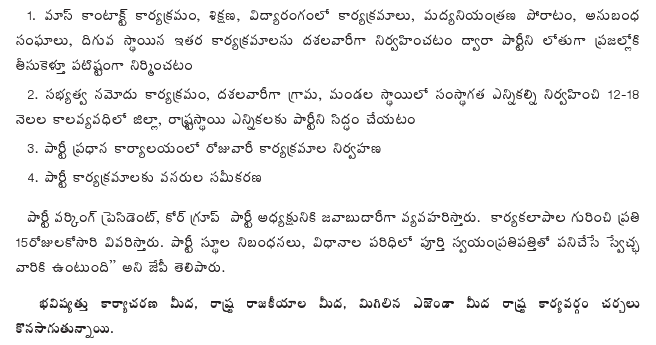 Mr. Katari Srinivasa Rao, General Secretary, said the party had adopted a resolution demanding that the Government review its policy of promoting liquor consumption which has ruined the lives of lakhs of families in the State. He pointed out that traditional parties are shedding crocodile tears over liquor addicts’ plight after having allowed their workers to corner liquor licenses. The resolution demanded immediate closure of belt shops and sitting rooms attached to liquor outlets and suggested that village panchayats be empowered to reject location of wine shops. The party expressed its readiness to work with all parties and NGOs committed to restricting liquor consumption.