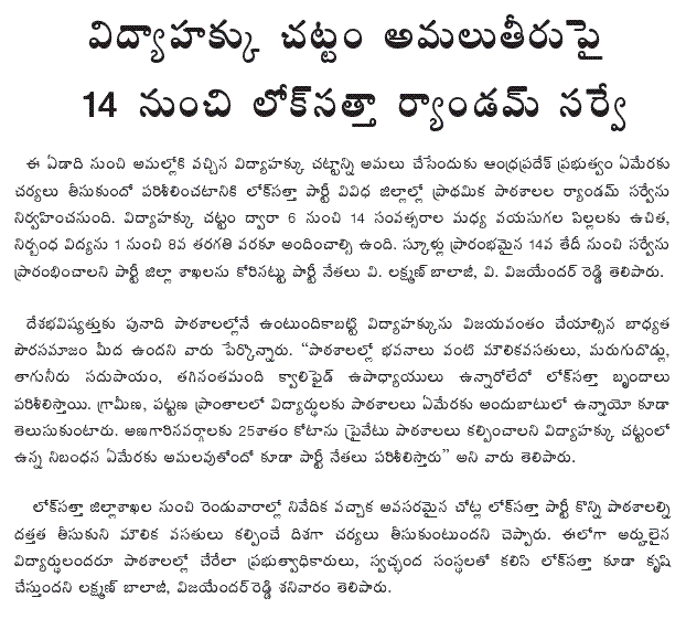 The Lok Satta teams will examine whether the schools have the basic infrastructure like buildings, toilets and drinking water facility and adequate number of qualified teachers and whether they are accessible to students in both urban and rural areas. The Act provides that even private schools have to set apart 25 percent of their admissions for children belonging to the disadvantaged sections.