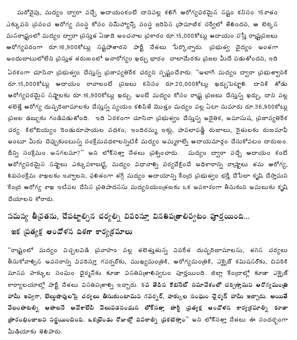 The leaders quoted a NIMHANS study to underline that while the Andhra Pradesh Government earns Rs.15000 crore revenue in the ensuring Excise Year on liquor sales, the people will be spending Rs.16900 crore on healthcare costs. Assuming that they spend Rs.20000 crore on liquor purchases, the total outgo people’s pockets works out to Rs.36900 crore in a single year.