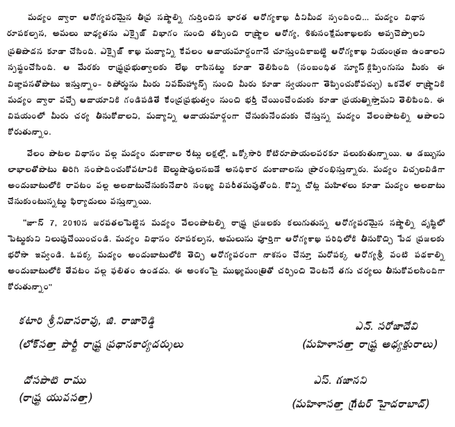 The Lok Satta requests Your Excellency use your good offices as per the constitution framework and to intervene with the Government and ensure that steps are taken to restrict liquor consumption. We suggest that the following measures may be considered: