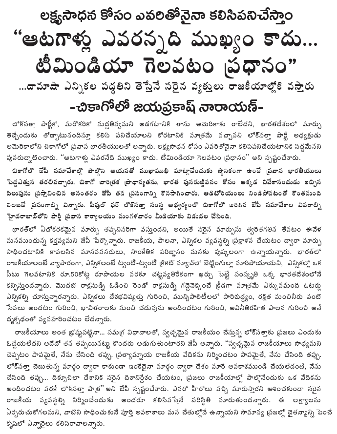 Dr. JP, now on a tour of the U.S., said in a message that Andhra Pradesh has unfortunately been battered by one natural calamity or the other beginning with prolonged drought to unprecedented floods and severe cyclone now in the last one year. It is time that every one transcended politics and went to the rescue of people threatened by the cyclone.