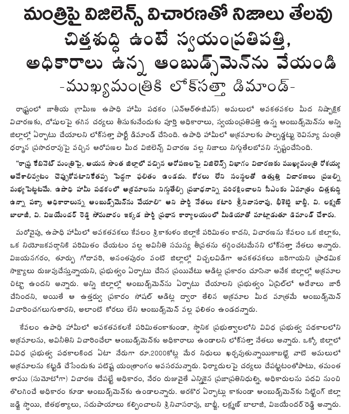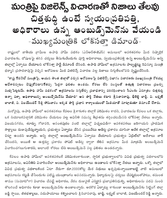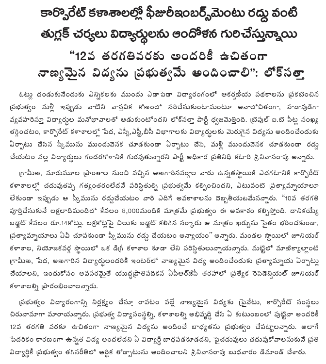 On the State Government proposal to provide land on lease to self-help groups, the Lok Satta leaders said that the Government seemed to be encouraging cooperative farming through the backdoor. Since cooperative farming had not been a success anywhere in the world, the proposed Government scheme would be a financial disaster.