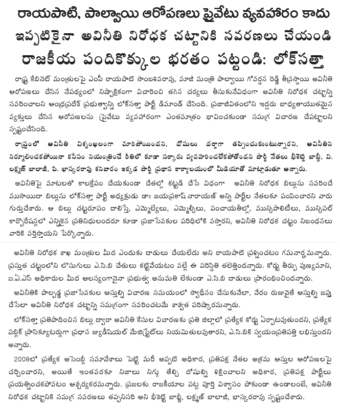 Talking to the media, Lok Satta Party leaders Mr. Katari Srinivasa Rao, Mr. Bheesetti Babji, Mr. V.Lakshman Balaji, Mr.V.Vijayender Reddy said that reports of irregularities have been pouring in from all districts and not merely from Srikakulam. By limiting the inquiry to Srikakulam district and that too works in the Revenue Minister’s constituency, the Chief Minister seemed to be minimizing the gravity and magnitude of the problem.
