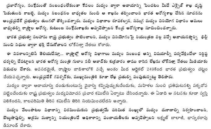 The Lok Satta leaders in a letter to the Union Health Minister Gulam Nabi Azad wanted him to ensure that concrete measures are put in place so that Health Departments are empowered to oversee all alcohol-related issues, in the States. If necessary, the Government of India can legislate under Article 249 of the Constitution on a subject in the State list.