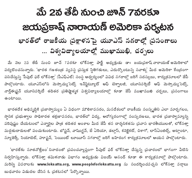 The Lok Satta Party today welcomed the Union Government’s road map for empowering local governments through formation of district councils, reorganization of Legislative Councils with two-thirds representation to local governments and 50 percent reservations for women and rotation of their constituencies once in 10 years.