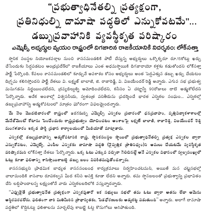 Talking to the media, party leaders Mr. V. Laxman Balaji, Mr. G. Raja Reddy, Mr. V. Vijayendar Reddy said it was amazing that for the mere prospect of sitting in the Legislative Council candidates are prepared to spend enormous amounts. The Upper House cannot decide the fate of the Government, pass any money Bills or even delay any legislation beyond 90 days.