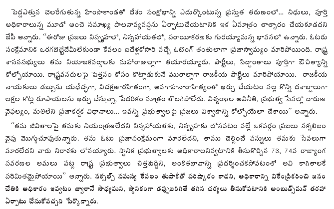 Dr. JP said that “it is a sense of helplessness and despair over lack of control over their lives that are driving a section of people to embrace naxalism. They are frustrated because their vote has not translated into public good and their tax contributions have not led to delivery of services. The 73rd and the 74th Constitutional amendments aimed at empowering local governments have remained on paper because State Governments are not sincere or serious about implementing them.”