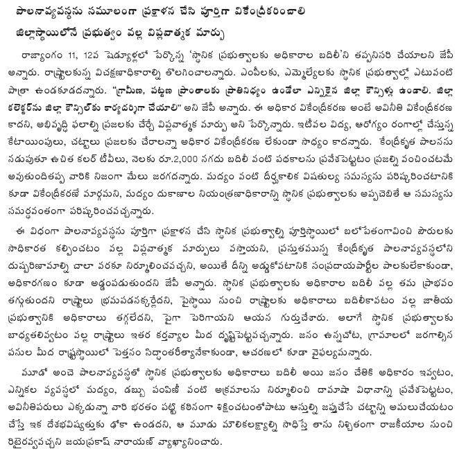 Dr. JP said that transfer of powers mentioned in the 11th and 12th schedules of the Constitution to local governments should be mandatory. The States shall be stripped of their discretionary powers. MPs and State legislators should have no role to play in local governments. There shall be an elected district council representing both rural and urban areas. The District Collector shall be made Secretary of the district council.