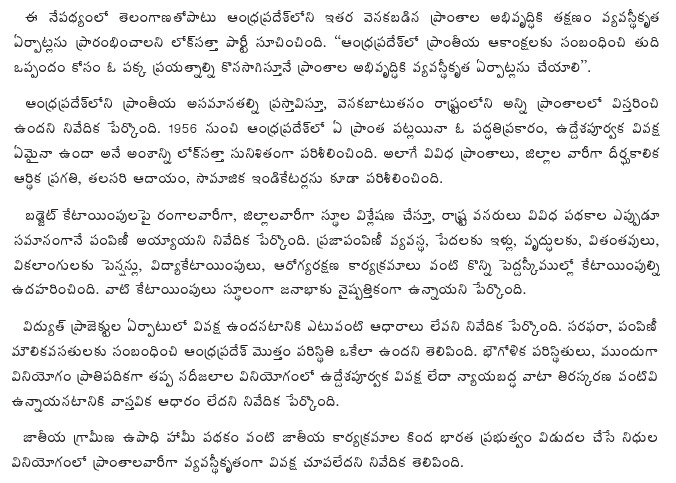 Dealing with regional disparities in Andhra Pradesh, the report says that backwardness is distributed across all regions. The Lok Satta carefully examined whether there has been any systematic and organized discrimination of any region in Andhra Pradesh since 1956 as also the long-term trends of economic growth, per capita income and social indicators among the various regions and districts of Andhra Pradesh Making a broad assessment of budget allocations, sector-wise and district-wise, the report says that state resources have always been equitably deployed under various schemes. It refers to some of the biggest programmes like the public distribution system, housing for the poor, pensions for the aged, widows, and the disabled, education grants and healthcare programs and says the allocations under them are roughly proportionate to the population.