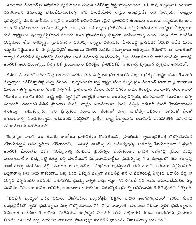 The party warns against adopting a casual approach to the demand for Telangana. It points out that Andhra Pradesh is the first non-Hindi state witnessing demands for division despite a common language. "It is important to have a national, tangible, universally acceptable marker to reorganize states. Language has been such a marker so far, and all non-Hindi states are formed on the basis of one language - one state. Now we need to carefully examine other markers before setting out to reorganize our states. Neither history nor geography nor development is sufficient as a marker. Once language ceases to be a marker for state formation, we should decide what a rational criterion for the division of states is. Once these questions are addressed, solutions can be found. Any ad hoc approach in one part of the country will lead to escalating demands and a cascading effect elsewhere. Therefore, a rational and deliberate approach based on consensus and longterm interests is critical."