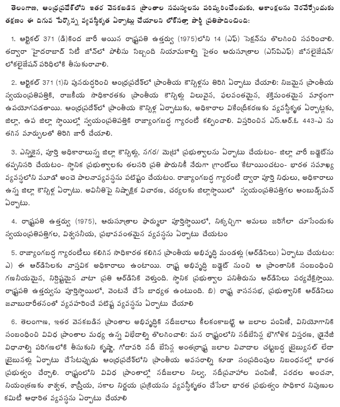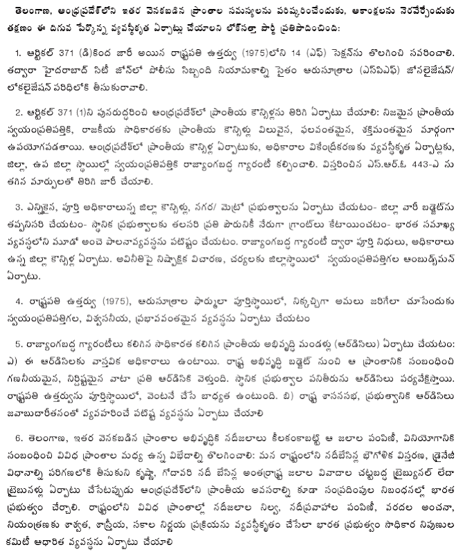 The Lok Satta, therefore, recommends that institutional arrangements be made immediately to address the concerns and aspirations of Telangana and other backward regions in Andhra Pradesh. "The arrangements can be taken up complementary to any efforts towards evolving a final settlement of the regional aspirations in Andhra Pradesh."