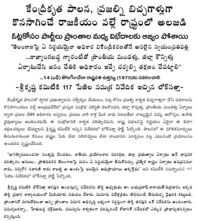 Loksatta's Report to Srikrishna Committee can be downloaded from http://www.loksatta.org/cms/documents/skc.pdf