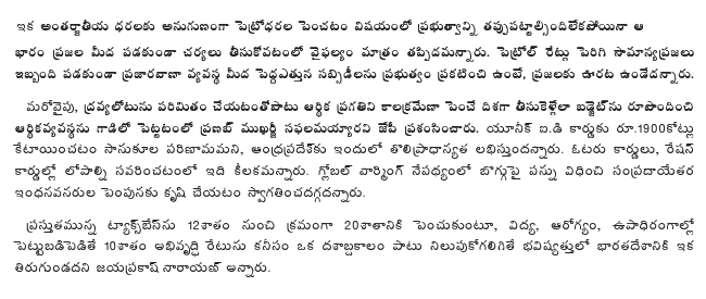 Dr. JP, who described the increase in petroleum product prices as inevitable whichever party happened to be in power, regretted that the Union Finance Minister had not paid any attention to subsidizing public transport. The Union Finance Minister, who levied a cess on coal to encourage clean technologies in the context of global warming, should have thought of public transport as a complementary means to curb emission of harmful gasses by the ever proliferating private transport vehicles.