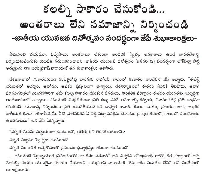 The youth leaders, carrying placards calling for inter-regional amity, garlanded the statue of Swami Vivekananda on Tank Bund, and distributed clothes to pavement dwellers in Dissukhnagar. Among those who took part in the activities today were Yuva Satta GHMC President Ravinder Reddy, Mangala, Sivaji, Ramu, Ramalinga Reddy, Sridhar and Srinivasa Reddy.