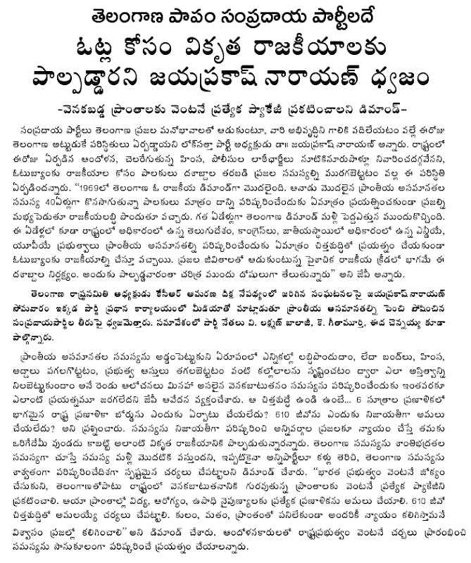 Now the government at Union and State level should immediately address the legitimate problems of backwardness in Telangana and other regions, said JP. Honest and effective implementation of G.O. 610, constitution of an empowered state Planning Board, a comprehensive package for Telangana and all other backward regions, strong measure to ensure education and employment to all youth, and empowerment of local governments as district level and below must be integral to any meaningful effort to solve the problem.