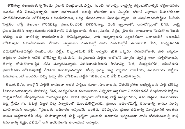 In contrast to them, the Lok Satta believes in the innate wisdom of the voters who are self-respecting and love their children and families. The party believes if power is given to them they will transform society.