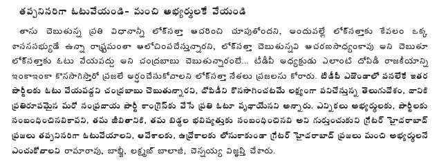 The Lok Satta holds its meetings without hiring people at huge expense in terms of money, liquor, food and transport. Does Babu believe that millions of rupees have to be spent to conduct meetings?