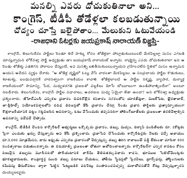 The Lok Satta does not lure voters with money and liquor or other inducements. Does Babu believe he cannot win votes without offering them?