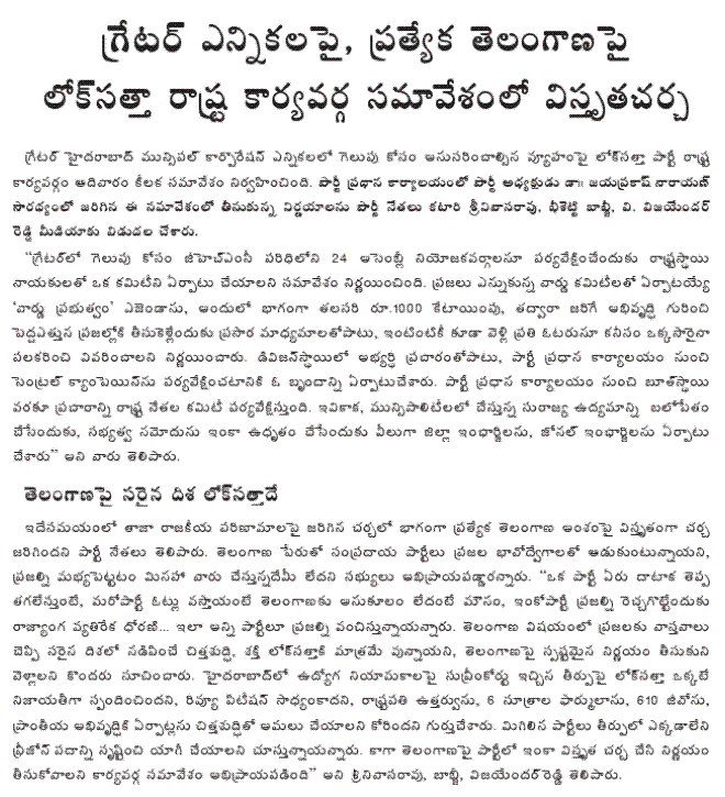 The Lok Satta supported the Supreme Court judgment upholding the Presidential Order on the implementation of the six-point formula. In contrast, both the Congress and the TDP found themselves on the same side in seeking a review of the verdict. Both the Congress and the TDP sought to camouflage the fact that the Supreme Court had nowhere talked of a Hyderabad free zone. The Supreme Court merely upheld the zonal regulations that were honored between 1975 and 2001.