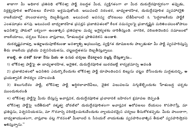 Dr. JP said in his letter, “Even at this stage, I earnestly appeal to you to stop the reckless, immoral, malicious mudslinging against Lok Satta Party, support and lead the effort to enact the law proposed by the Lok Satta to fight corruption in public life, and participate in a reasoned public debate to establish the truth about the finances and public morality of the Telugu Desam Party and the Lok Satta Party.”