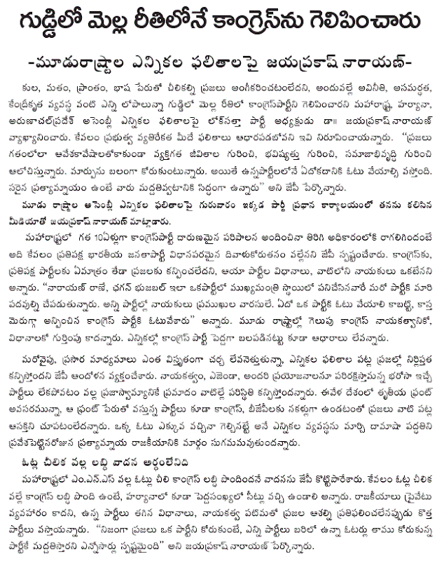 “The State Government is focusing its attention on extending Arogyasri coverage to all the people without realizing that Arogyasri has not guaranteed health to even to those who are covered by it, charged the Lok Satta Party here today. Arogyasri is not a cure-all.