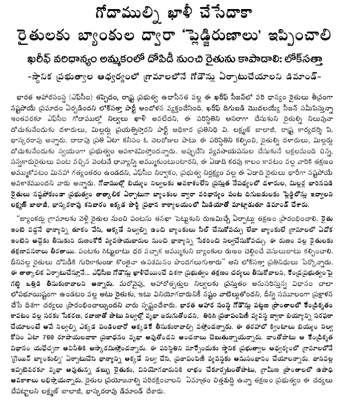 To save such farmers from exploitation by rice millers and their middlemen, the Lok Satta Party suggested that banks give pledge loans to farmers on their stocks. Such paddy could be sealed at the farmer’s residence itself or stored at a common point in a village and taken as mortgage, they suggested. Such farmers could sell their crop when they received a better price in the market and clear their pledge loans.