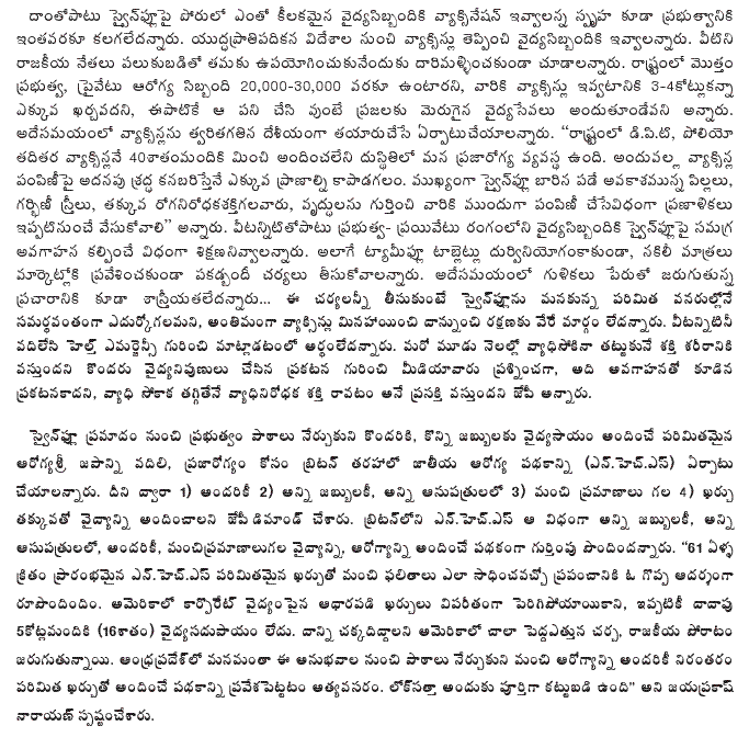 Dr. JP demanded that vaccines for swine flu be imported on a war footing and administered to health care employees numbering not more than 30,000 throughout the State. Priority should be given to vulnerable sections like pregnant women, children, the aged and those with impaired immune systems in vaccination. Care should be taken to ensure that politicians did not hijack the vaccines.