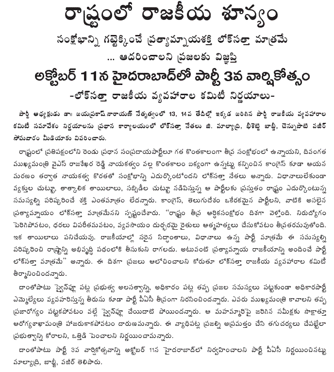 Briefing the media on the two-day deliberations of the party’s Political Affairs Committee (PAC), party leaders G. Malyadri, Bhisetty Babji and Chennupati Wajir said that the two personality-oriented parties made extension of subsidies and concessions as the centerpiece of their policies, for want of long-term strategies. The demise of Dr. Y. S. Rajasekhara Reddy threw the Congress into a greater crisis.