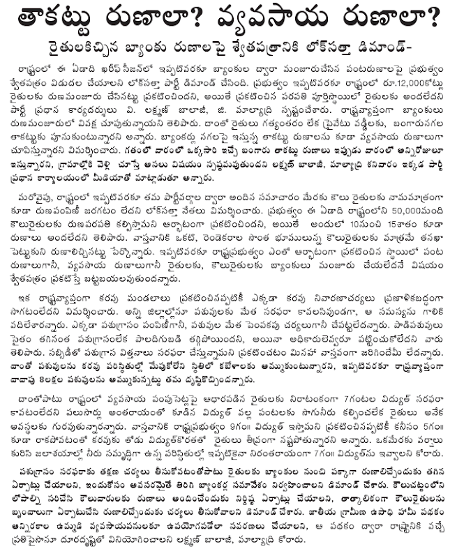 Talking to the media, Dr. JP said that the Andhra Pradesh Government has been guilty of violating the spirit of Constitutional amendments No.73 and 74 under which it is expected to devolve powers, resources and personnel on local governments. The Government sought to further weaken the local governments by deciding to entrust NREGS works to nominated committees instead of the elected panchayats.