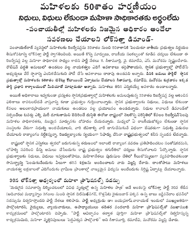 The Lok Satta Party today announced the names of some of the important people who would be heading the party and its women and youth wings in some districts.