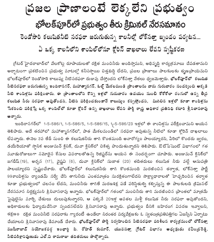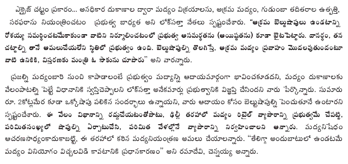 The Lok Satta leaders said that under the Excise Act, the Government is expected to control sale of liquor by unauthorized outlets and manufacture and supply of illicit liquor, gudumba etc. “Mr. Rosaiah has now not merely justified the existence of the illegal belt shops but also conceded the Government’s inability (read unwillingness) to eliminate them. In other words, according to Mr. Rosaiah, the Government cannot implement its own laws. He provided a justification for the existence and proliferation of belt shops by arguing that their elimination would facilitate flow of illicit liquor.