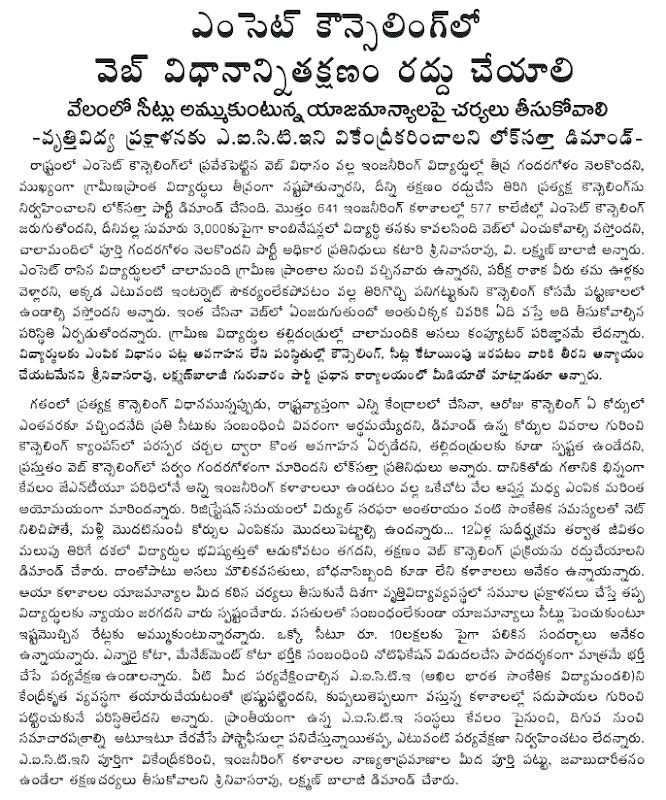 The Lok Satta leaders said that there are a number of engineering colleges without the basic infrastructure and teaching faculty. Some college managements are openly selling seats for up to Rs.10 lakh each. The Government should ensure that the seats under the NRI and management quotas are filled as per strict and transparent norms.
