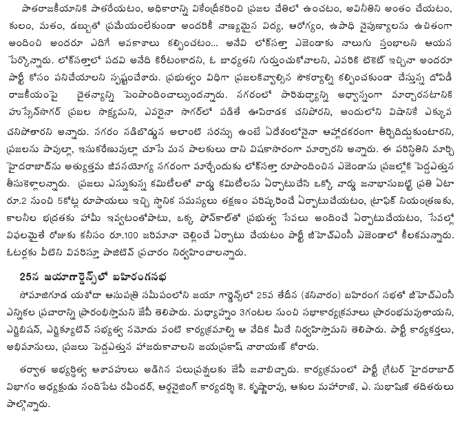 “The Lok Satta, if given power, will enable a citizen’s charter with time limits and penalties for delays in services. A 24-hour call center will be opened, all complaints registered and recorded, and time limits will be fixed for delivering basic services. If there is no delivery of service in time, the complainant will get Rs.100 a day as penalty.